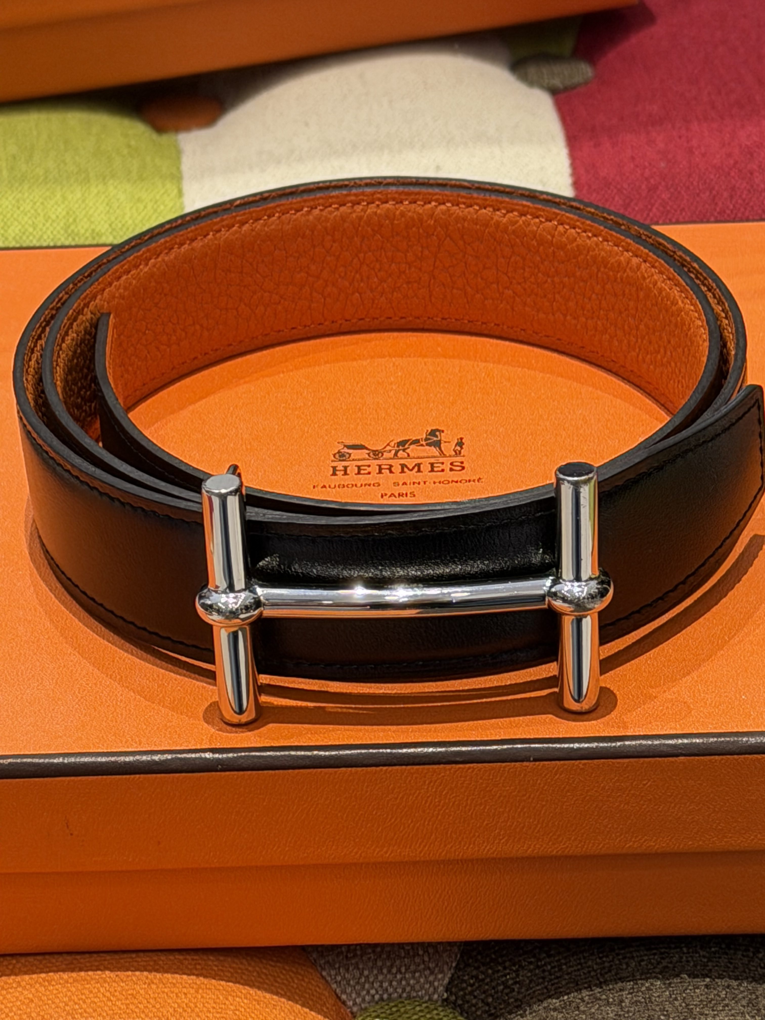 Ceinture en cuir réversible noir et orange avec boucle en argent taille 85 HERMÈS