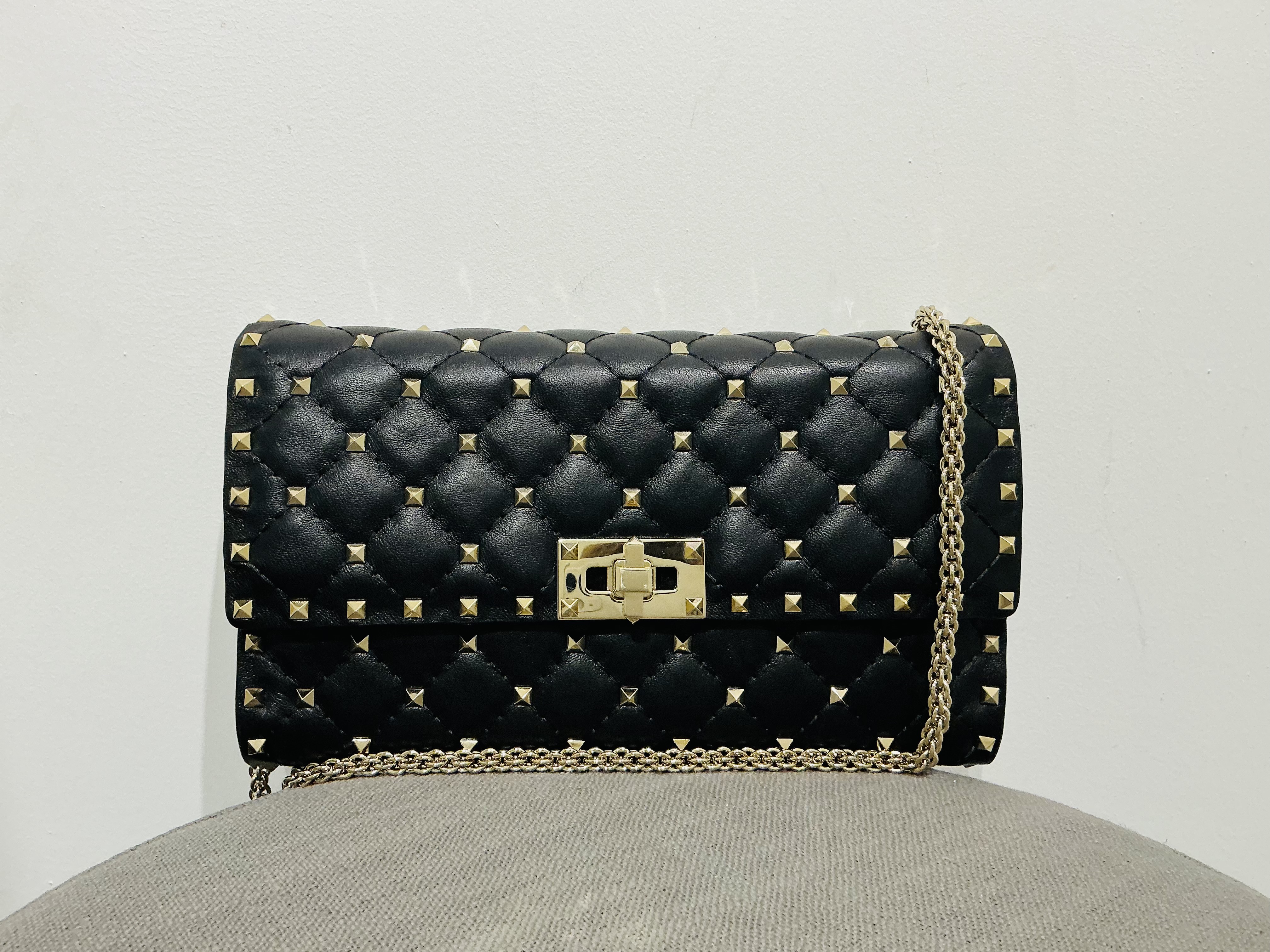 Petit sac Rockstud en cuir noir avec chaîne et bijouterie couleur champagne VALENTINO